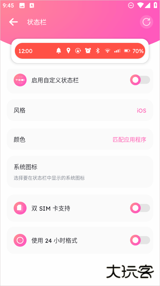 自定义状态栏是一款非常实用的手机状态栏自定义工具,通过软件用户可以自定义自己的状态栏显示方式,涵盖了店里、信号、wifi信号强度、蓝牙、闹铃、定位、静音等。软件拥有非常简约的界面设计,用户一眼便可查看软件的所有功能,而且用户还可以一键开启和关闭自定义状态栏,满足了用户不同场景的使用需求。