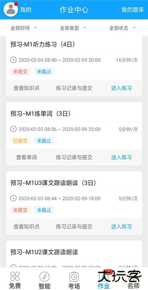 1、【作业】预习下册:练单词、课文跟读朗读、听力等,完成后保存提交,老师可以看到全班学生完成情况