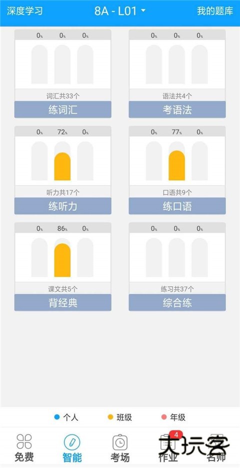 5、【智能】里面有每单元的词汇、听力、拓展、语法等智能练习,智能专项和辅导。(智能专项练习辅导,查漏补缺,保持好成绩)