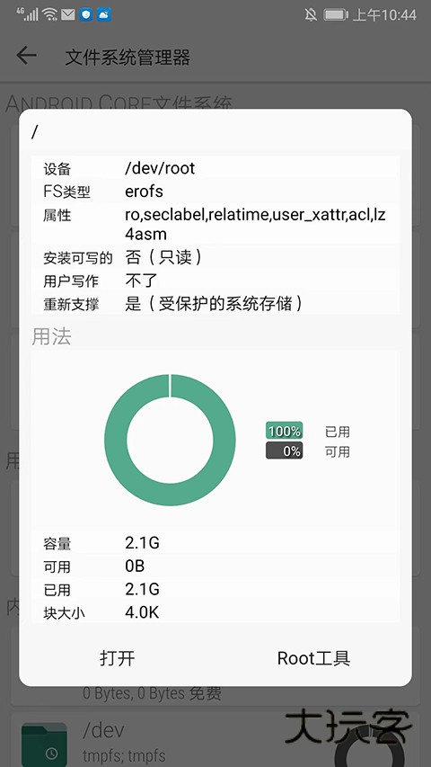 3、进入文件系统管理器界面,包括不同类型的文件系统、用户存储等信息,用户可根据需求打开或者使用Root工具,