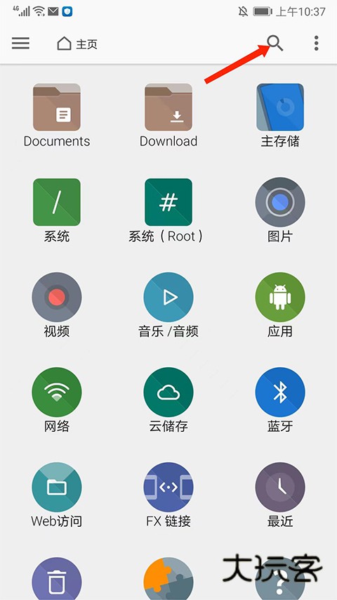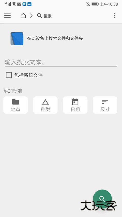 1、打开fx文件管理器中文版,进入应用主界面,选择右上角【放大镜】图标,可以输入文本和添加地点、种类、日期尺寸等条件来搜索当前设备上的文件和文件夹,