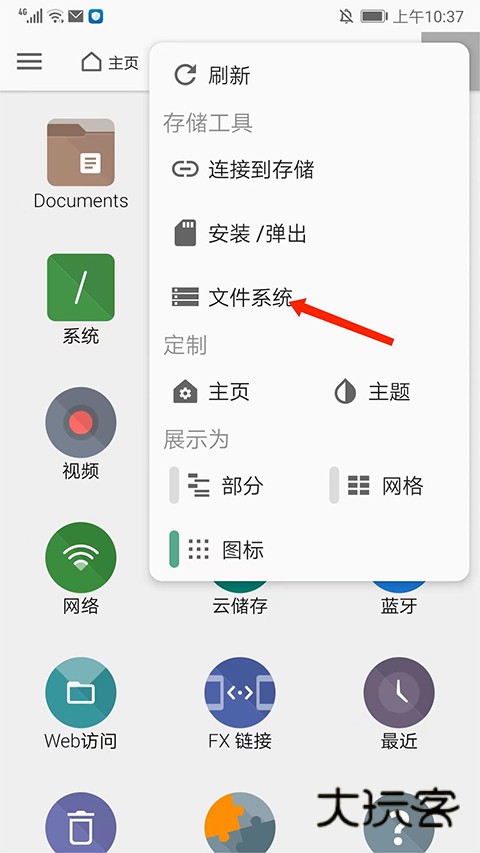 2、返回主界面,点击右上角【三个点】图标,弹出菜单窗口,包括刷新、连接到存储、安装/弹出、文件系统、定制和展示的设置等菜单功能,这里以【文件系统】为例,