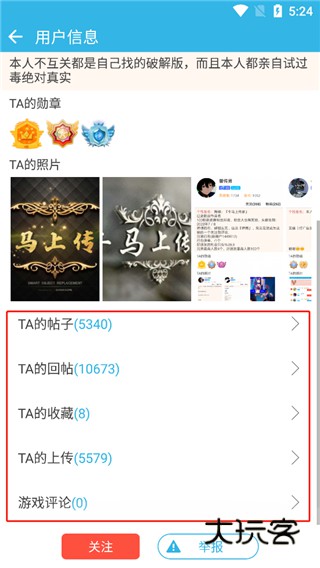 4、往下翻看,我们可以他们ta的帖子、上传、回复、收藏等等信息;