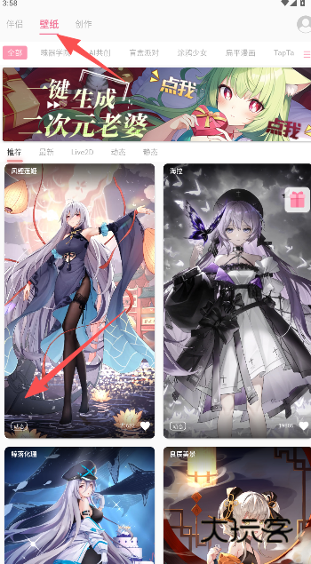1、点击进入软件,默认伴侣页面切换至壁纸栏,找到你所感兴趣的壁纸类型打开查看。