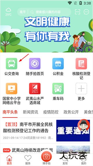 1、在本站下载安装掌上南平app并打开,点击公交查询;