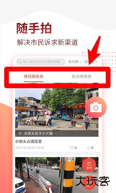 1、随手拍功能帮助市民快速上传投诉内容,选择分类后系统将自动派单处理反馈。