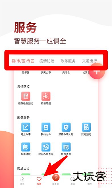 3、服务页面集成疫情防控、政务服务和交通出行功能,满足日常智慧办事需求。