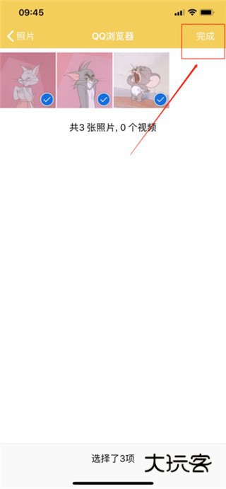 4、进入手机相册界面,将需要打包的照片全部选中,点击“完成”,如下图所示。