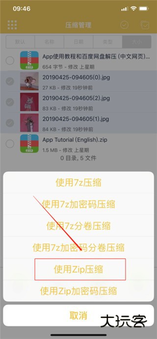 6、跳出压缩形式,选择“使用zip压缩”。可以根据需要选择自己想要的压缩方式,包括加密压缩都是可以,如下图所示。