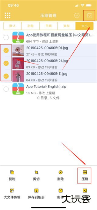 5、点击右上角压缩文件的选中按钮,将上传的所有需要打包的照片选中,点击“压缩”,如下图所示。
