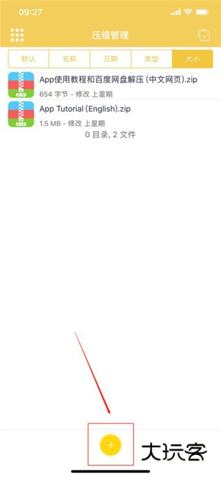 2、下载完成之后,在手机桌面上找到并进入“解压专家”app界面。点击软件界面最下方的黄色“+”号,如下图所示。