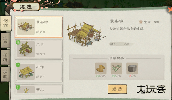 1、建筑分制作、居所、生产、功能,可查看材料、耐久及繁荣度信息。