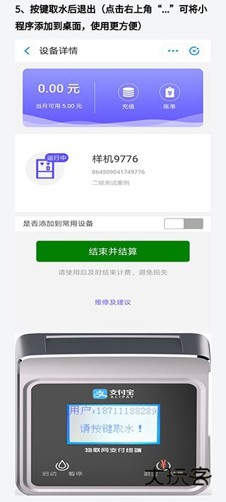 5、按键取水后点击机器上的退出按钮,或者在app上选择结束并结算。