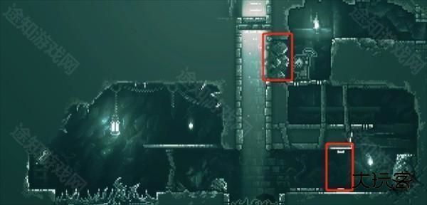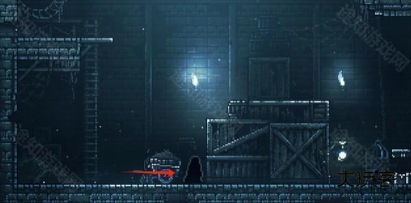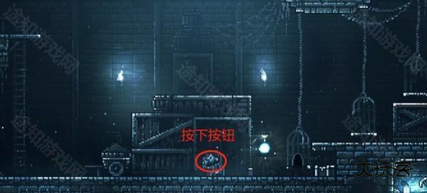 7、流浪者视角。按下黑色怪物左边的按钮,3个铁笼升上去,爬上铁笼往右走,然后爬最右边的梯子上去。
