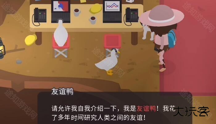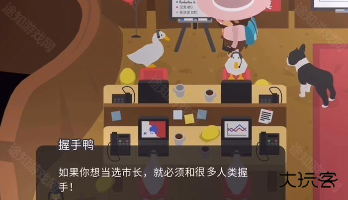 2、接着和握手鸭学习如何握手然后去城镇找到三十个头上有黄色感叹号的人握手。