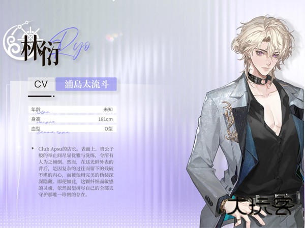 ClubApsu的店长。表面上,贵公子般的举止间尽显优雅与洗练,令所有人为之倾倒。然而,在这光鲜外表的背后,是因复杂的过往而留下的残破不堪的内心,而被他用完美的伪装深深隐藏。即便如此,这颗纤细而敏感的灵魂,依然渴望拼尽自己的全部去守护那唯一珍贵的存在。