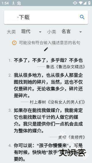 据意查句是一款内容十分丰富的名句查询应用。这款应用收录了众多的文言文以及现代白话文名句,各种俗语和歇后语也是有的,用户能够通过关键词在检索所需要的相关名人名言。同时,这款应用还采用了先进的人工智能算法,能够分析用户的搜素词,去检索相关的语句,体验下来是非常智能的。并且,这款应用搜素的时候还有着非常多的限定分类来缩小搜素范围。