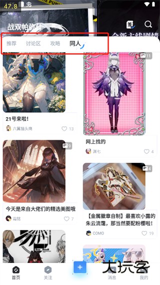 2、首先,作为一个游戏社区,库街区为用户提供最新的游戏资讯和动态,方便用户快速获取游戏关键信息,如提供【推荐】、【讨论区】、【攻略】、【同人】等不同的内容版块。