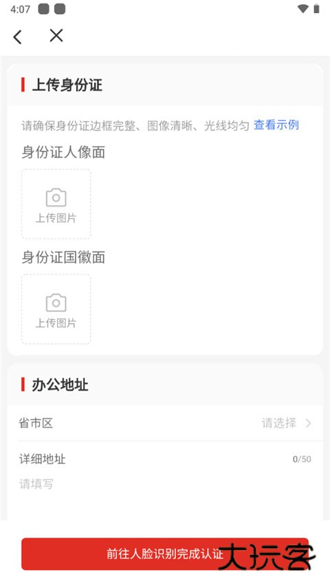 4、上传自己的身份证正反面,输入办公详细地址,点击前往人脸识别认证;