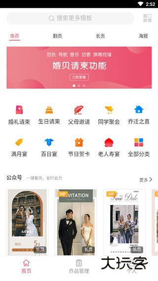 婚贝请柬是一款电子请柬制作软件。软件内有丰富多样的请柬风格以及海量制作模板,可以在结婚、表白、生日等各种重要场合制作好发送给亲友,邀请他们来参加。软件中请柬制作也非常简单,用户根据软件提示进行操作,替换或添加素材,就能完成请柬制作,再根据使用场景不同,可以输出不一样的格式,如H5页面、海报等。