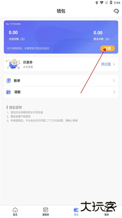 2、进入首页,点击钱包进入充值,充值后才可以使用。