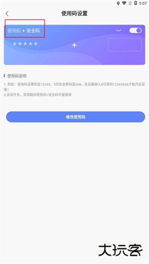 6、使用码设置需要使用码加安全码两部分组成,用户可以自行设置。
