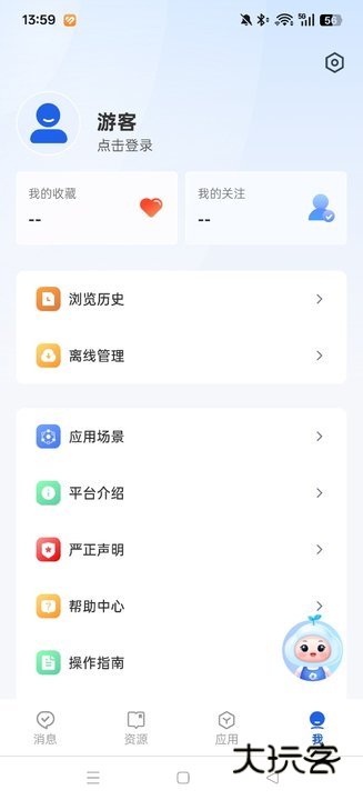 2、注册操作在软件我的界面中完成,可以很清楚的看到当前用户身份为游客,先选择上方的点击登录。