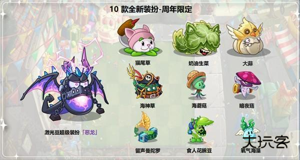 周年限定装扮:「海神草」全身装扮、「海蘑菇」周年装扮、「暗夜菇」周年装扮、「留声曼陀罗」周年装扮、「食人花豌豆」周年装扮、「氧气海藻」周年装扮