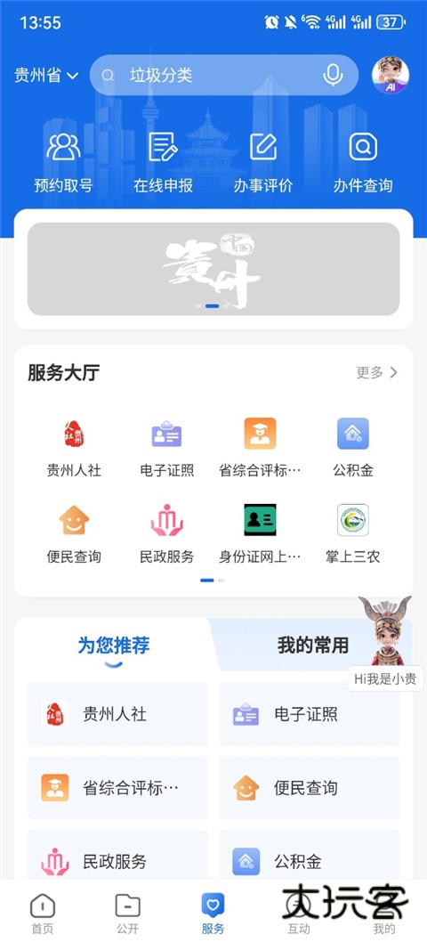 1、登录中国贵州全省移动应用平台App,点击“服务”板块,在“服务大厅”选择“更多”;