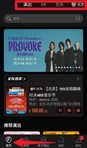 2、在“首页”可浏览推荐演出、热门活动及所在城市演出信息,支持快速切换城市进行定位查找。
