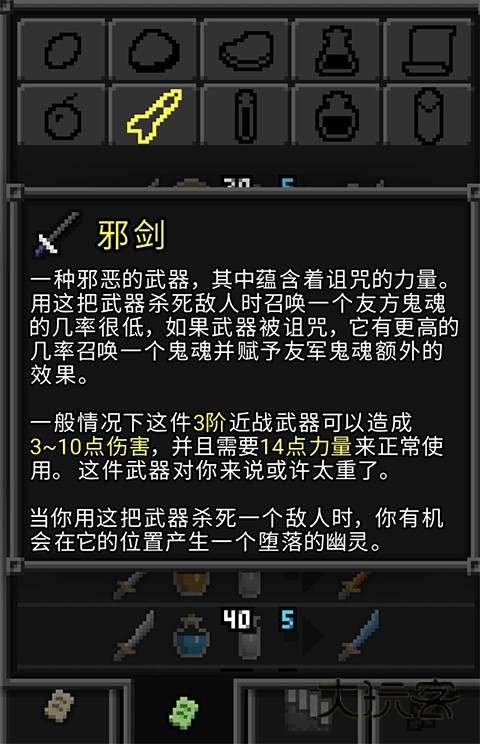 3、邪剑,这把武器的效果触发判定并不是用其击杀实体,当这把剑在你手上的时候一切实体死亡后都会触发判定,被强化的次数越多判定成功率越高,推荐可以配合哨卫法杖使用,哨卫也是一个实体,当哨卫释放激光自动消亡时,同样经过邪剑的判定,可以手动刷小弟,配合术士使用效果更佳。