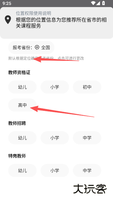 2、开启手机位置以后,软件会根据你所在的省份,为你进行细化分类的相关课程服务推送,请按照如下条件去设置筛选。