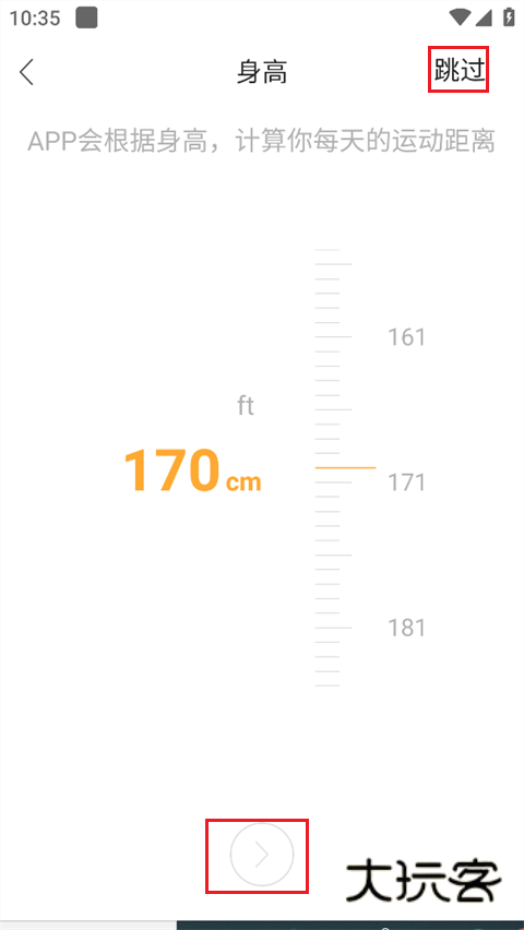 1、点击打开智慧手环3,根据实际情况选择自己的身高,然后点击下方红框处,也可以直接右上角跳过。