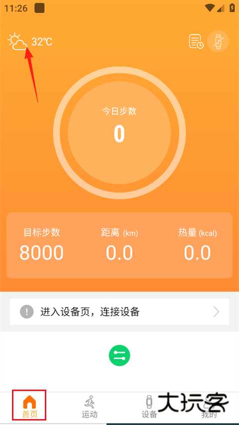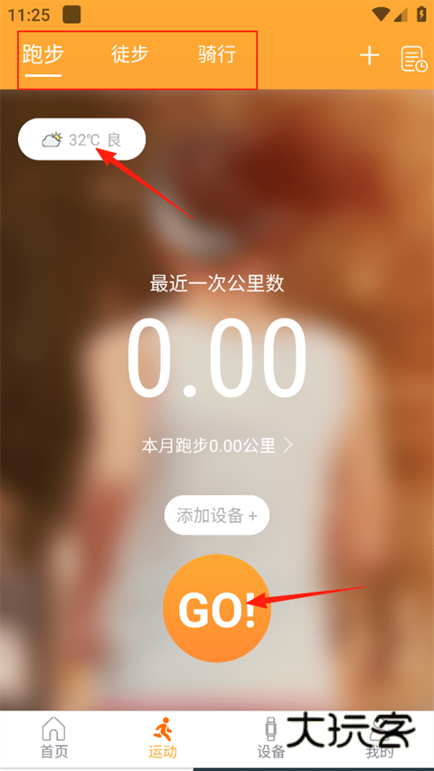 6、点击下方箭头处,即可开始运动监测,左上角箭头处可看到当天的天气情况,最上方红框处,可以选择运动方式。