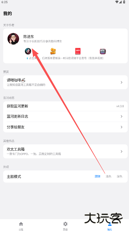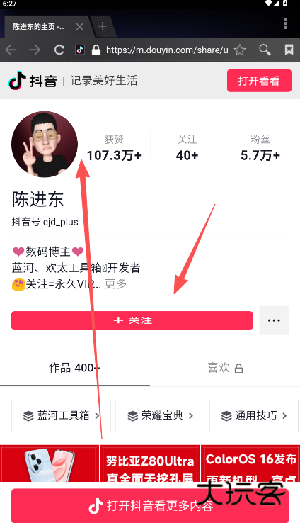 2、蓝河工具箱作者的发布渠道主要是在抖音短视频,点击跳转他的个人主页,找到关注选项即可。