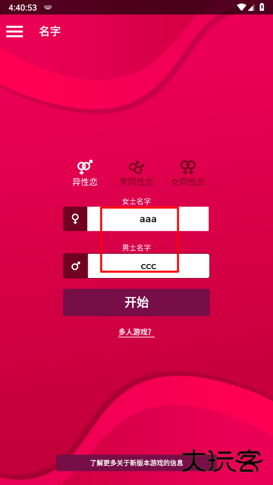 1、在6ll下载安装,进入后输入男士和女士的名字,点击"开始"。
