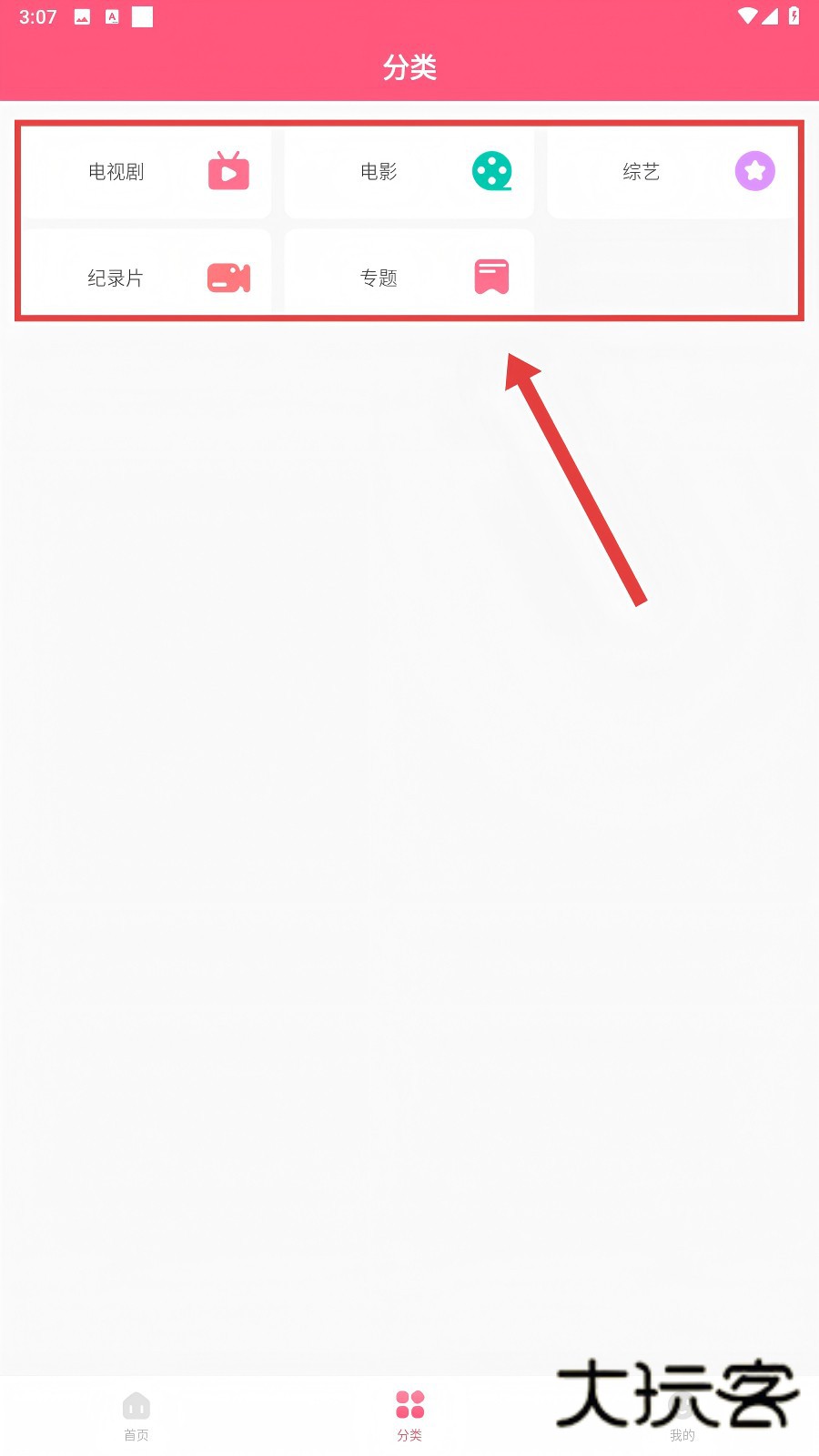 1、打开软件,在首页下方点击【分类】按钮,就能进入影视分类界面,方便咱们筛选想看的内容哟。