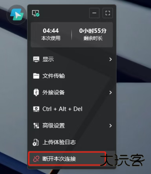 1、在悬浮球中点击【断开本次连接】即可断开云电脑,退出后云电脑资源将被回收,请及时备份数据,以防丢失