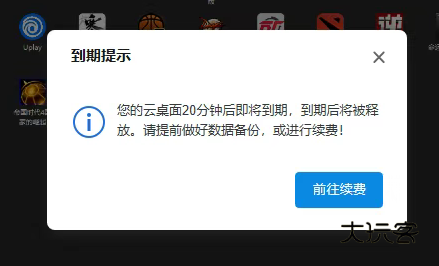 如使用套餐时长少于20分钟,将会出现即将到期提示,可按需点击【前往续费】,延长云电脑使用时间
