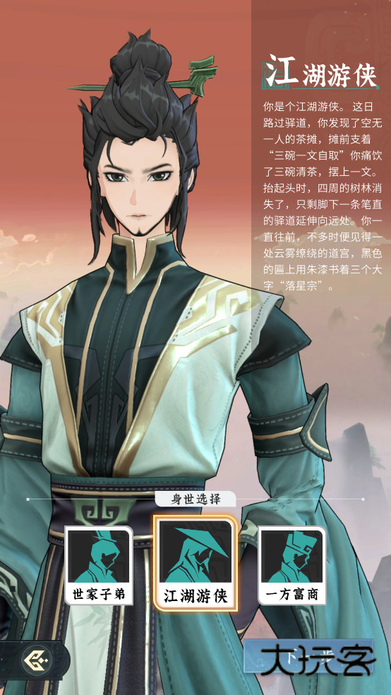你是个江湖游侠。 这日路过驿道,你发现了空无一人的茶摊,摊前支着“三碗一文自取”你痛饮了三碗清茶,摆上一文。抬起头时,四周的树林消失了,只剩脚下一条笔直的驿道延伸向远处。你一直往前,不多时便见得一处云雾缭绕的道宫,黑色的匾上用朱漆书着三个大字“落星宗”