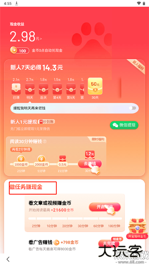 参与活动的朋友可以完成任务页面的相关任务来获得金币,完成任务后能得到对应的金币。通过审核的金币需要手动兑换成现金,计入个人账户中。游戏任务包括有完成签到、开宝箱、晒收入、阅读资讯、观看视频等。