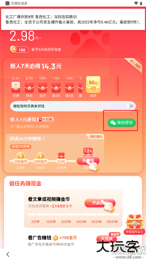 3、金币数量会自动转换成提现的现金,现金与金币的兑换比例为1:10000,当达到提现要求是,我们点击微信提现;