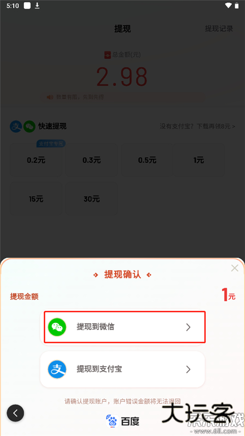 4、里面为用户提供了不同数量的提现金额,用户可以根据自己的现金总额来选择提现金额,如我们有2.9的总金额,点击1元;