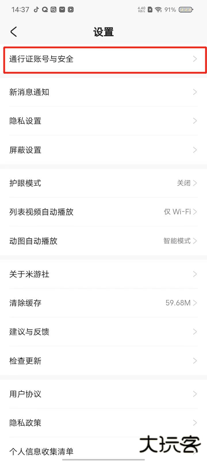 2、打开设置界面后点击上面的通行证账号与安全,在新页面中选择点击账号安全设置。