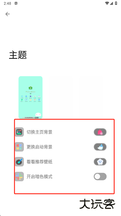 2、选择你要使用的操作,分为主页背景,启动背景,以及夜间模式