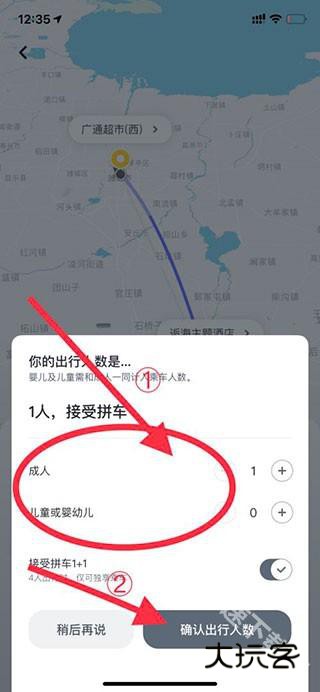4、再选择出行人数、儿童或婴幼儿人数、是否接受拼车1+1,选择完后点击下方确认出行人数选项。