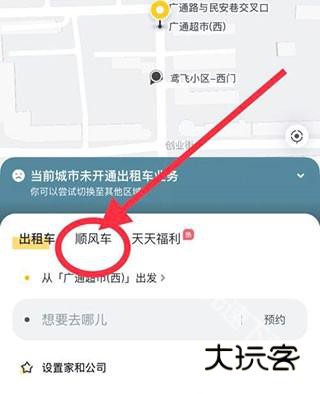 2、接着选择想要搭乘顺风车的出发地和目的地。