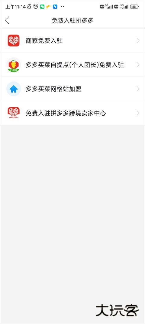 3、拥有商家免费入驻、个人团长免费入驻、买菜网格站加盟以及拼多多跨境卖家中心等四种入驻方式可以选择