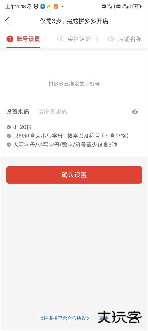 5、绑定完成后进入账号设定,只需三步即可完成开店