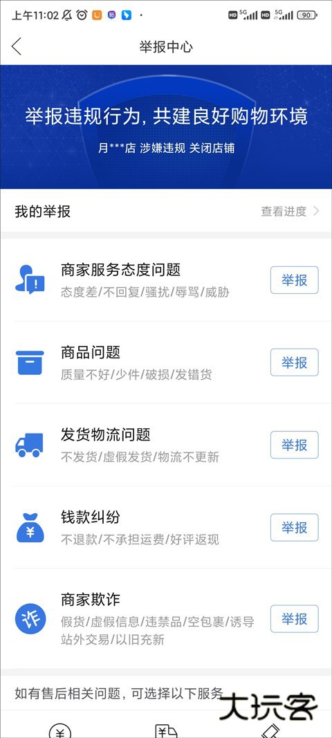 5、进入举报中兴,选择要举报的类型,点击右侧【举报】。